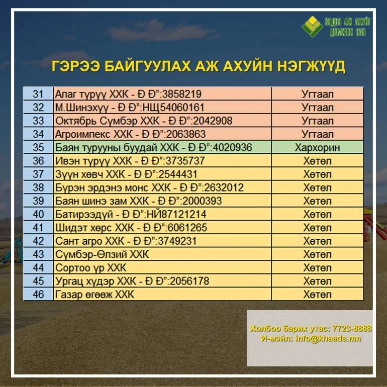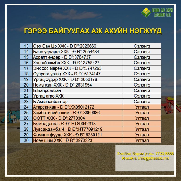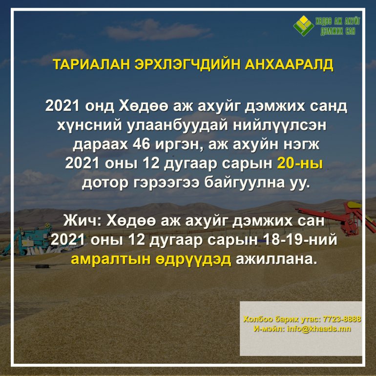 Хөдөө аж ахуйг дэмжих санд 2021 онд хүнсний улаанбуудай нийлүүлсэн дараах 46 иргэн, аж ахуйн нэгж 2021 оны 12 дугаар сарын 20-ны дотор улаанбуудай худалдах, худалдан авах гэрээгээ байгуулна уу. Манай сан энэ амралтын өдрүүд буюу 2021 оны 12 дугаар сарын 18-19-ний өдрүүдэд ажиллана.