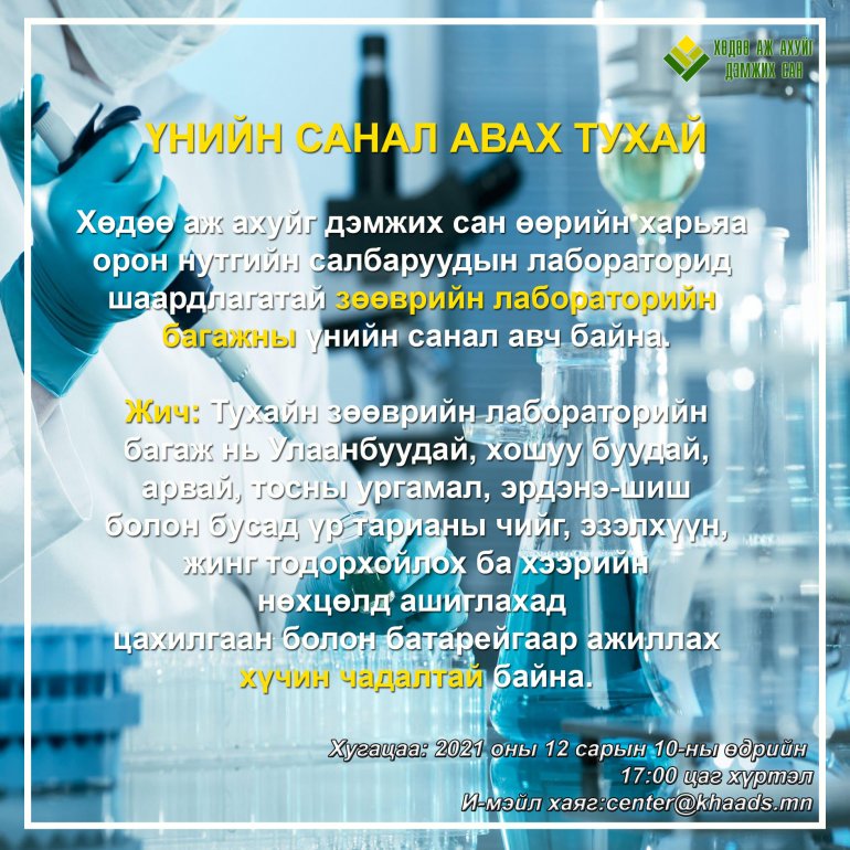 Хөдөө аж ахуйг дэмжих сан өөрийн харьяа орон нутгийн салбаруудын лабораторид шаардлагатай зөөврийн лабораторийн багажны үнийн санал авч байгаа тул та бүхэн 2021 оны 12 дугаар сарын 10-ны дотор center@khaads.mn хаягаар үнийн саналаа ирүүлнэ үү.