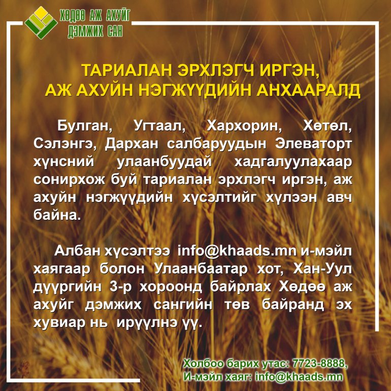 Хөдөө аж ахуйг дэмжих сангийн Булган, Угтаал, Хархорин, Хөтөл, Сэлэнгэ, Дархан салбаруудын Элеваторт хүнсний улаанбуудай хадгалуулахаар сонирхож буй тариалан эрхлэгч иргэн, аж ахуйн нэгжүүдийн хүсэлтийг хүлээн авч байна.