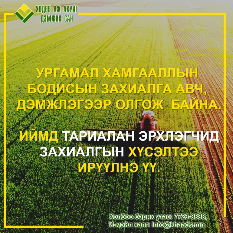 Уринш боловсруулалтад зориулж ургамал хамгааллын бодисын захиалга авч, дэмжлэгээр олгож байгаа тул тариалан эрхлэгчид та бүхэн захиалгын хүсэлтээ ирүүлнэ үү.