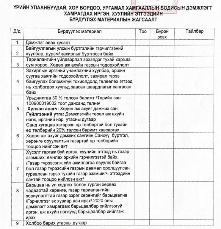 2021 оны хаврын дэмжлэгт хамрагдаж байгаа иргэн, хуулийн этгээд дараах материалыг бүрдүүлж гэрээ байгуулна уу.