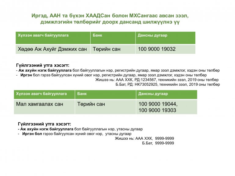 Иргэд, аж ахуйн нэгжүүд Хөдөө аж ахуйг дэмжих сангаас авсан зээл, дэмжлэгийн төлбөрөө дараах дансуудад тушаана уу.
