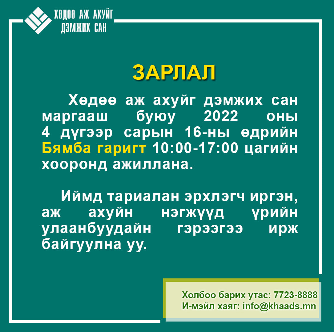 Хөдөө аж ахуйг дэмжих сан маргааш буюу 2022.04.16-ны өдрийн Бямба гаригт 10:00-17:00 цагийн хооронд ажиллана. Иймд тариалан эрхлэгч иргэн, аж ахуйн нэгжүүд үрийн улаанбуудайн гэрээгээ ирж байгуулна уу.