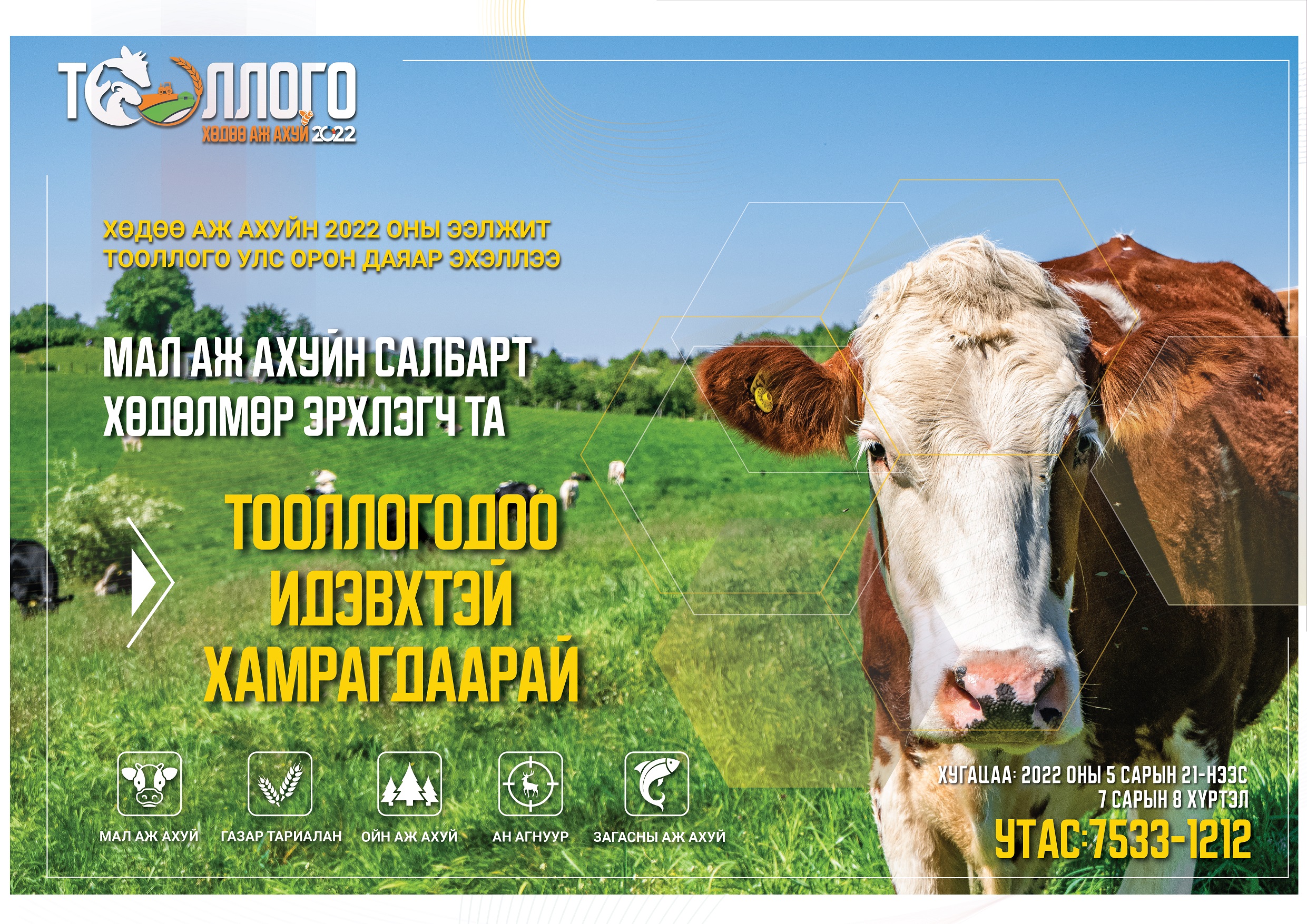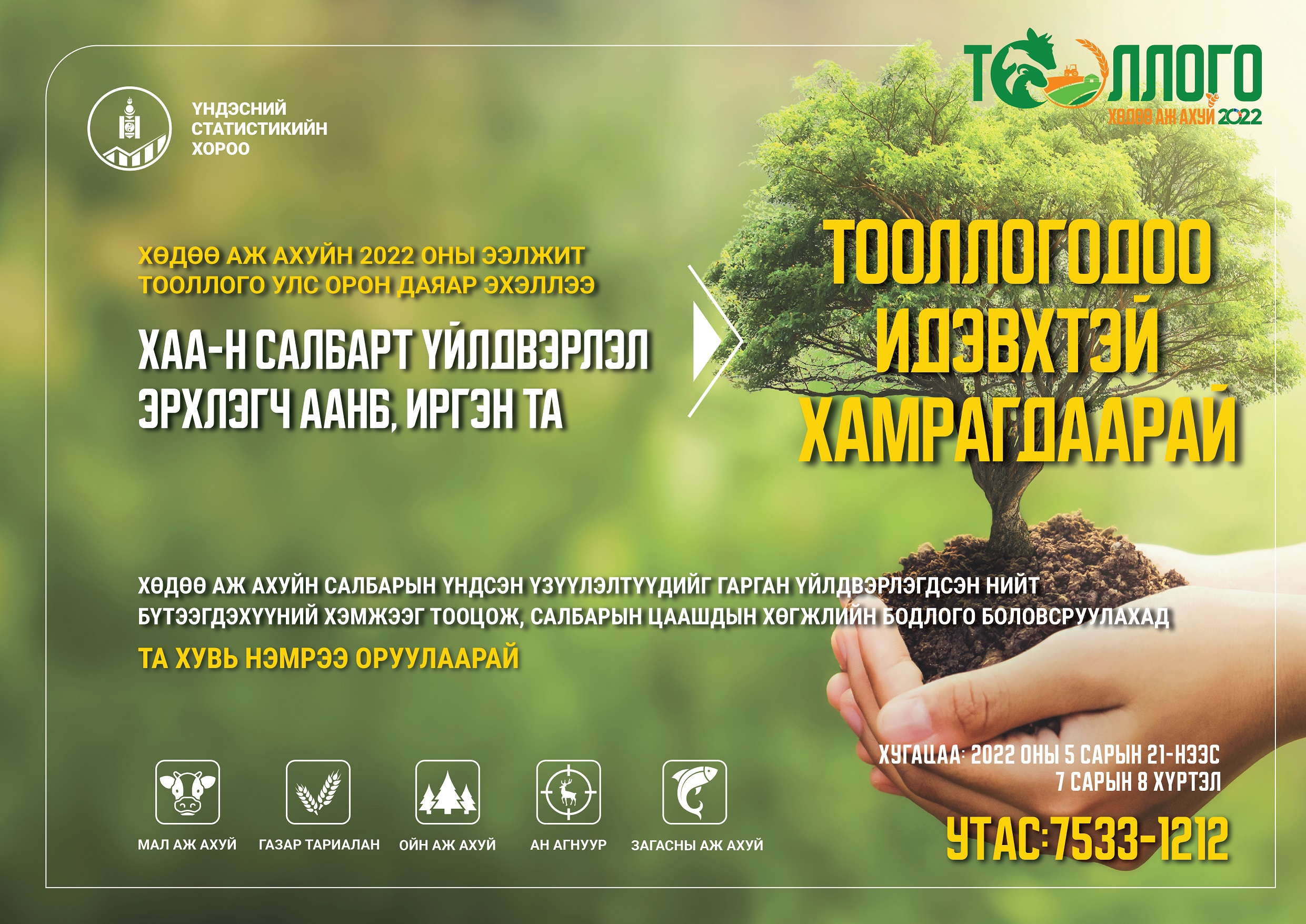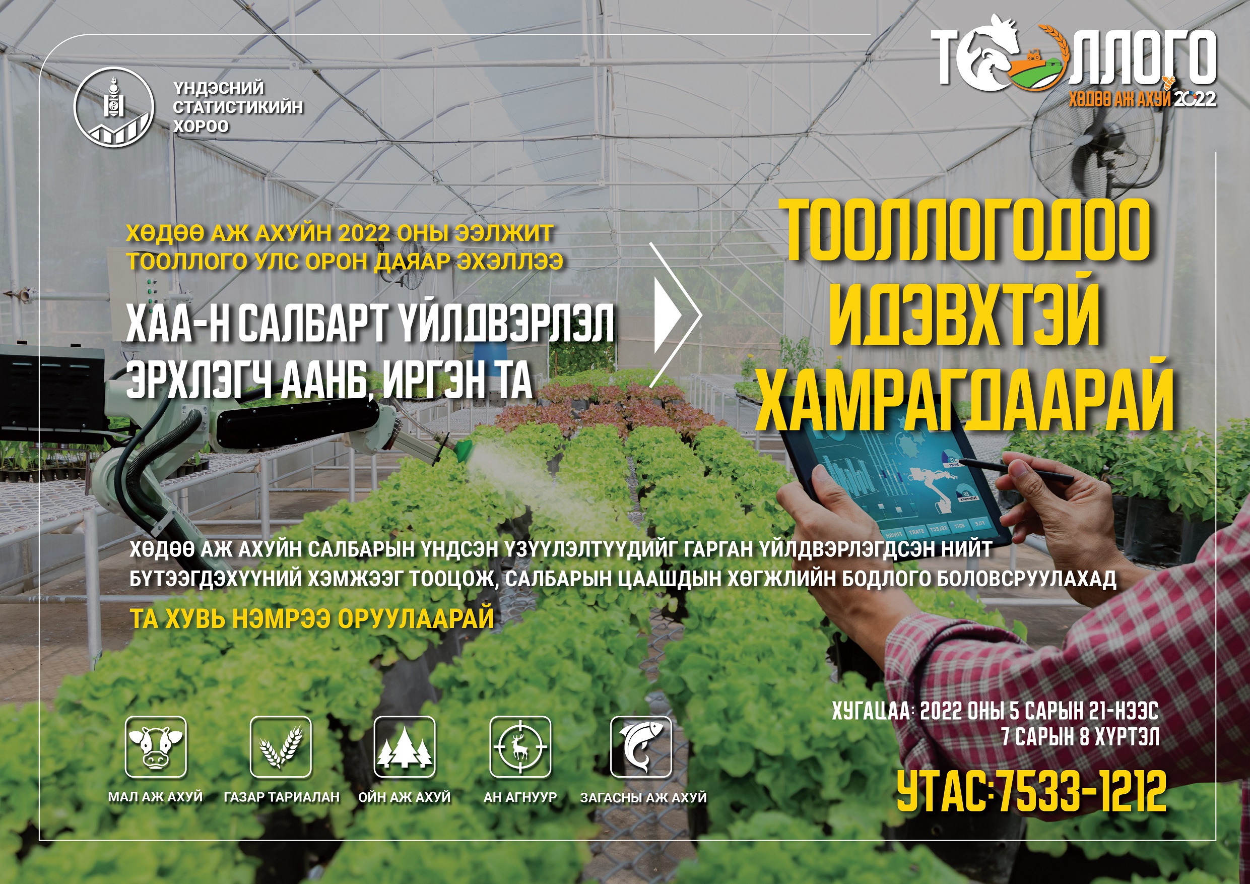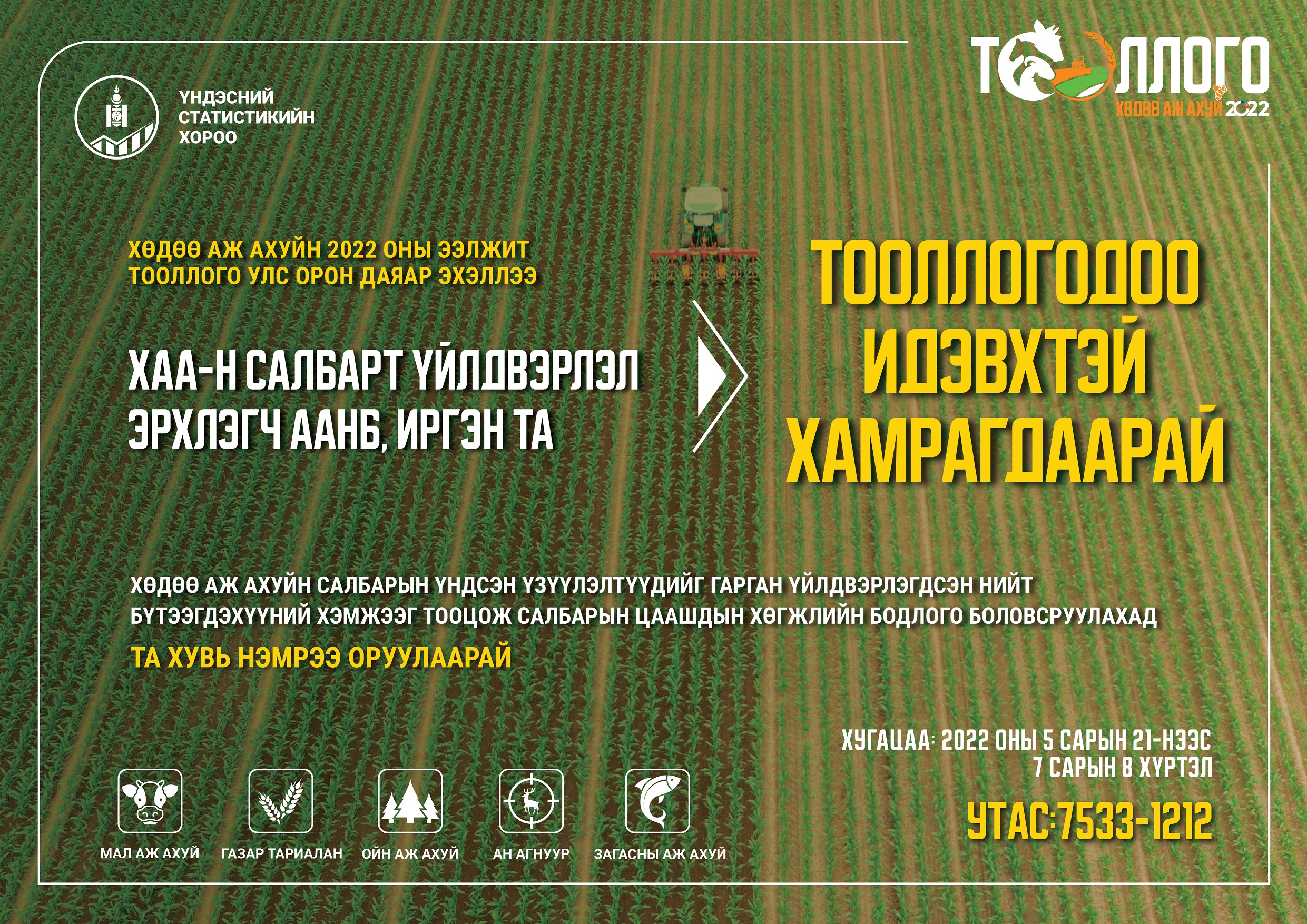 Монгол улсын Үндэсний Статистикийн Хорооноос Хөдөө аж ахуйн тооллогыг 2022 оны 05-р сарын 21-нээс 07-р сарын 08-ны өдрүүдэд орон даяар зохион байгуулж байна.