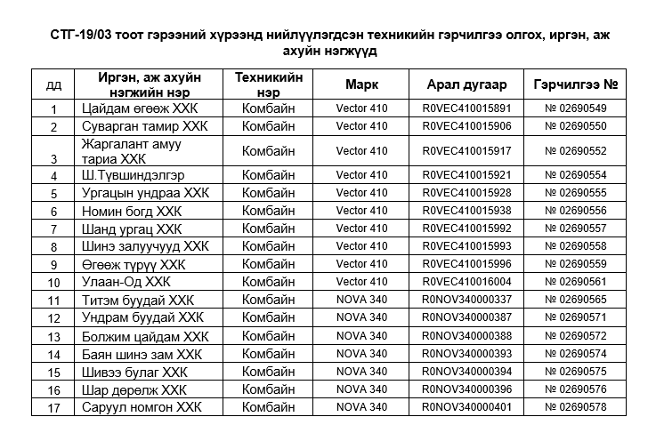 уг зээлийн хүрээнд нийлүүлэгдсэн үр тарианы комбайны техникийн гэрчилгээ, бусад
