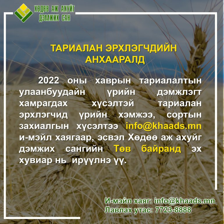 2022 оны хаврын тариалалтын улаанбуудайн дэмжлэгт хамрагдах хүсэлтэй тариалан эрхлэгчид улаанбуудайн үрийн хэмжээ, сортын захиалгаа ирүүлнэ үү.